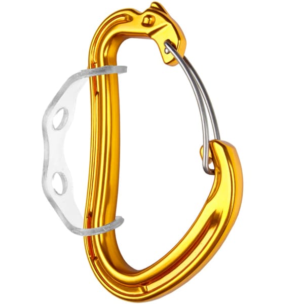 This climbing carabiner attaches to the harness with a rubber ring and is optimally positioned to receive or hold the gear needed during progression.